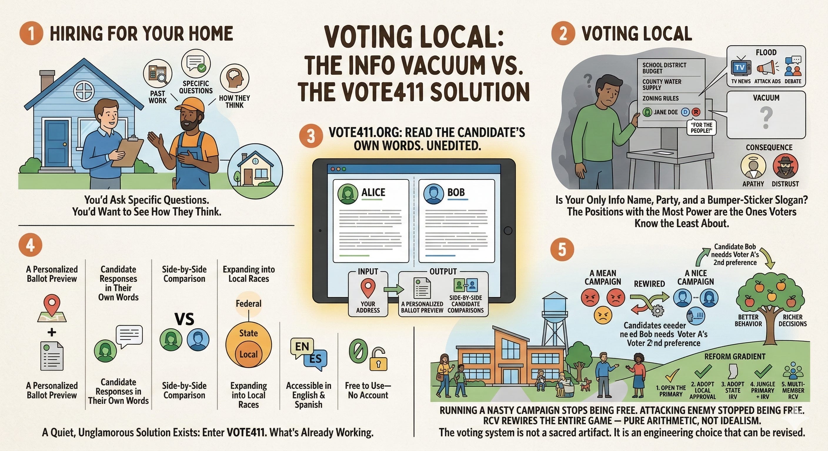Now imagine you’re voting for the person who will make decisions about your school district’s budget, your county’s water supply, or the zoning rules for your neighborhood — and the only information you have is their name, their party, and a bumper-sticker slogan.