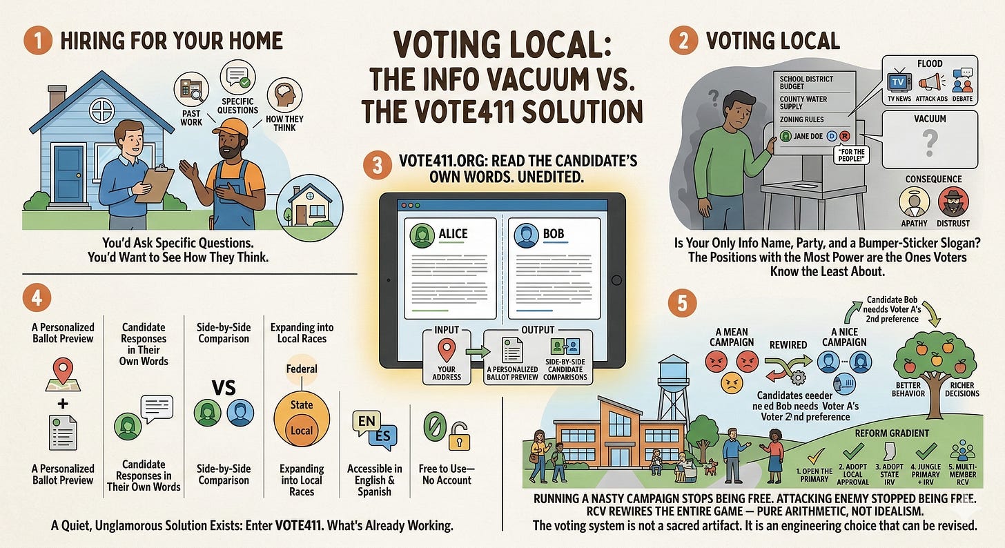 This series has been building a case that expressive voting — richer ballots, better systems, more honest signals — can improve democratic representation without waiting for federal action. VOTE411 fits that argument exactly: it improves the information environment at every level of government, costs nothing to use, and is available right now.