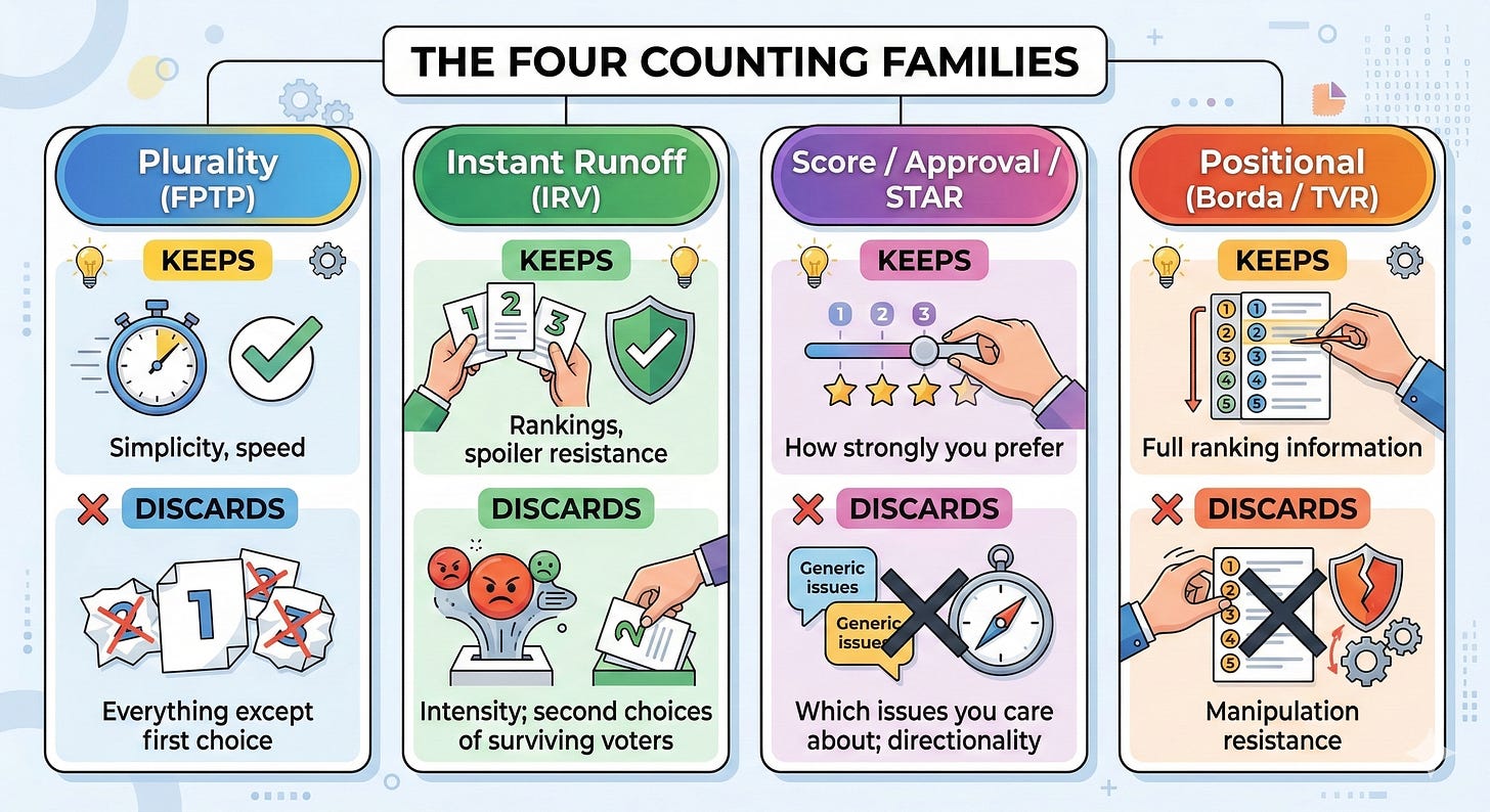 That’s the counting problem. The ballot is one thing. The algorithm — the mathematical procedure you use to turn ballots into a winner — is a separate thing entirely. You can change the algorithm without changing a single ballot. You can use the same algorithm on radically different ballots. The two decisions are independent.