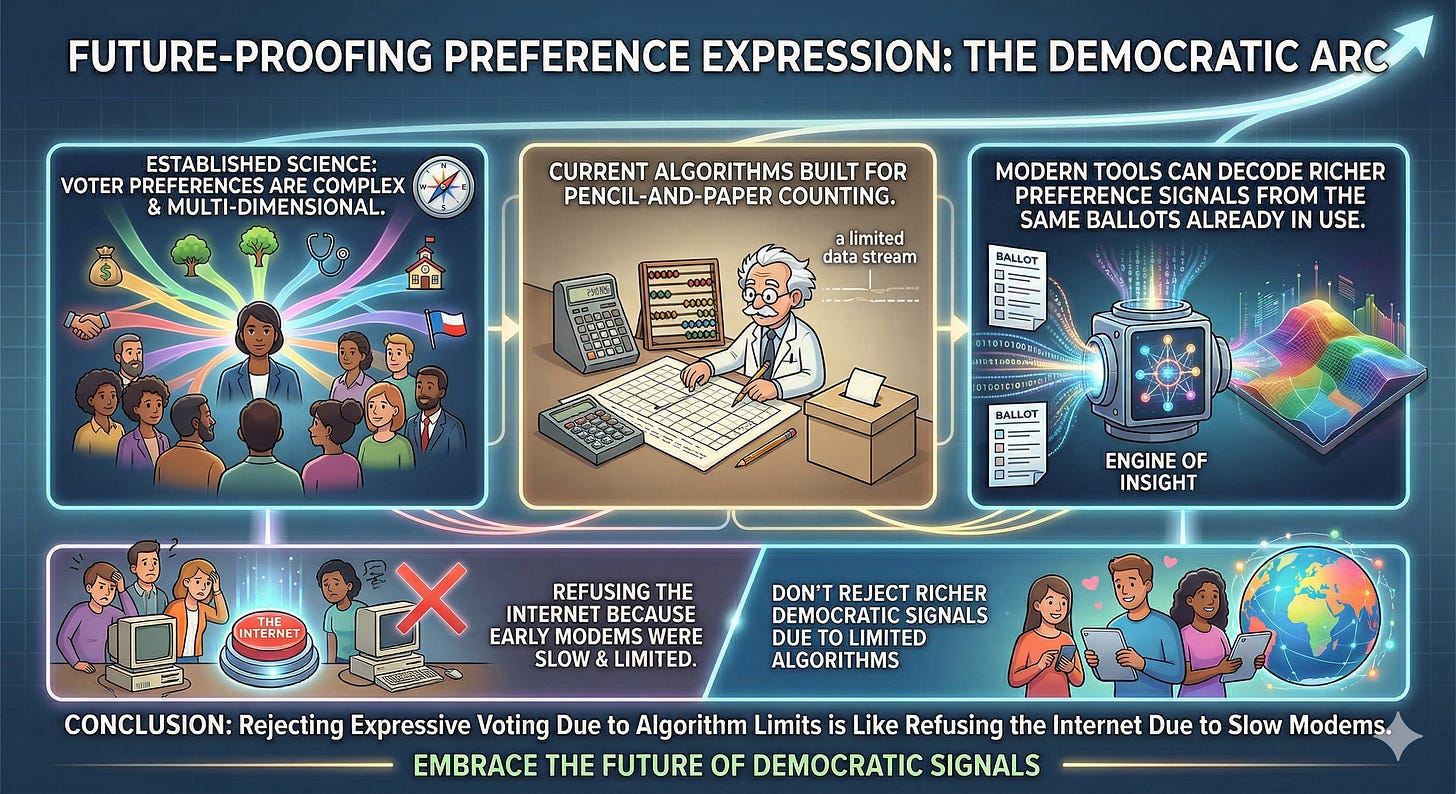 The objections to today’s counting algorithms — the center-squeeze problem in IRV, the intensity-loss in rankings, the directional-blindness of scoring — are not permanent features of expressive voting. They are limitations of specific algorithms that were designed under constraints that no longer apply. Rejecting expressive voting because of those limitations is like refusing to use the internet because early modems were slow.