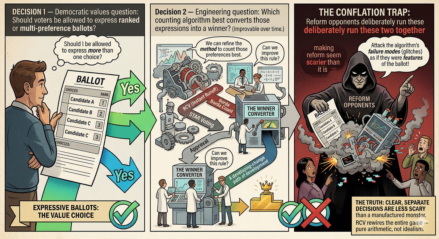 Most current political debates about “RCV” conflate these two decisions into one. Separating them makes the debate more honest, makes objections more specific, and makes the path to improvement much clearer.